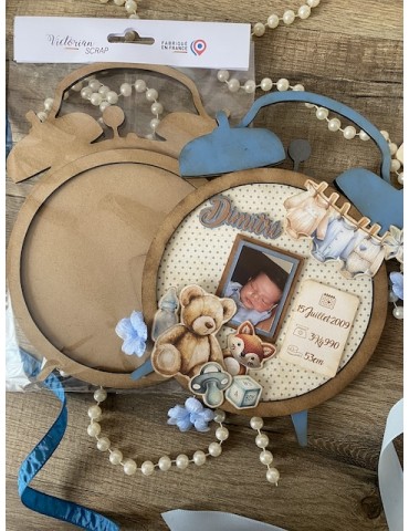 Support en bois en forme de réveil avec 4 éléments.